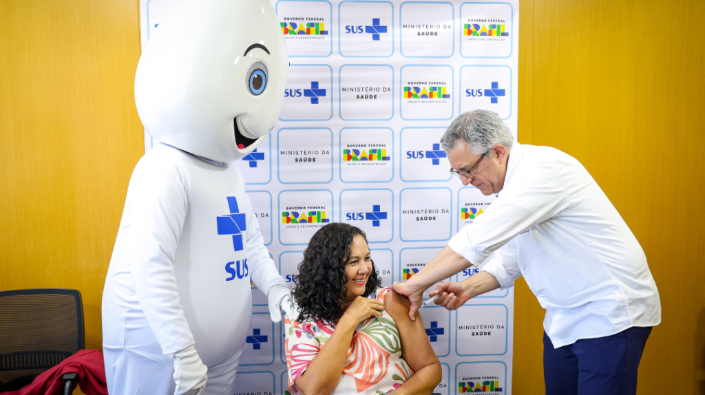 Nesta quarta-feira (16), o Ministério da Saúde realizou uma ação de vacinação contra Influenza e Covid na sede da Pasta. A ministra interina das Comunicações,