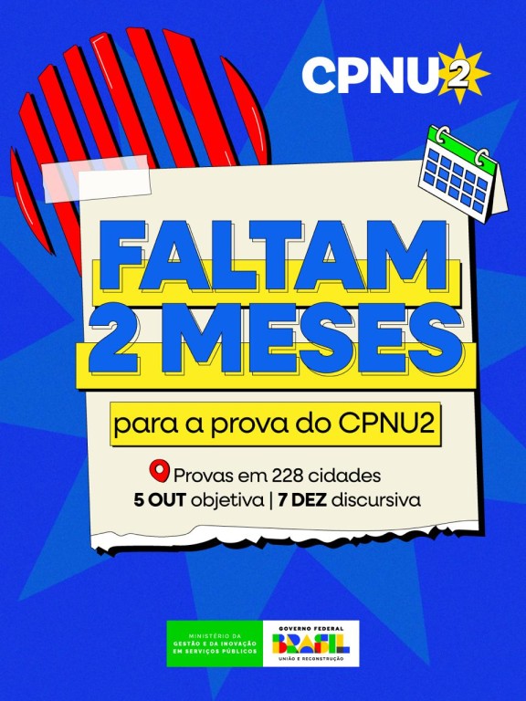Faltam exatamente dois meses para a aplicação das provas objetivas da segunda edição do Concurso Público Nacional Unificado (CPNU 2). Com 761.528 pessoas inscritas de 4.951 municípios brasileiros, o certame representa uma das maiores mobilizações logísticas e de segurança já realizadas pelo governo federal na área de concursos públicos. A prova objetiva está marcada para 5 de outubro e será aplicada simultaneamente em 228 cidades brasileiras, abrangendo todas as unidades da Federação. Já a prova discursiva acontece no dia 7 de dezembro.