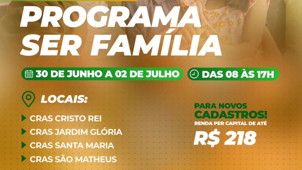 Entre os dias 30 de junho a 2 de julho, das 8h às 17h, os moradores de Várzea Grande que se encontram em situação de extrema vulnerabilidade social terão a oportunidade de realizar o cadastro no Programa Ser Família, iniciativa do governo do Estado de Mato Grosso, em parceria com a Prefeitura Municipal. O atendimento acontecerá simultaneamente nas quatro unidades do Centro de Referência em Assistência Social (Cras): Cristo Rei, Jardim Glória, Santa Maria e São Matheus.