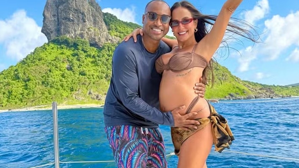 Carol Peixinho, de 40 anos, mostrou a barriguinha de gravidez durante um passeio por Fernando de Noronha. A ex-BBB, que espera um menino com o cantor Thiaguinho, compartilhou neste domingo (25), alguns cliques do momento de lazer. “Noronha é realmente mágica! Trouxemos Bento já para sentir essa energia surreal”, contou ela, que recebeu o carinho do cantor no barrigão.