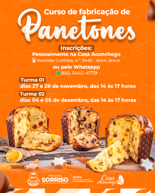 O espaço da Casa Aconchego abrigará uma pauta doce e saborosa. Isso porque já estão abertas as inscrições para o curso de fabricação de panetone. Mulheres interessadas em participar podem procurar a Casa Aconchego, localizada na Avenida Curitiba, n.º 3445, no Bom Jesus, das 7 às 11 e das 13 às 17 horas de segunda a sexta-feira para as inscrições.