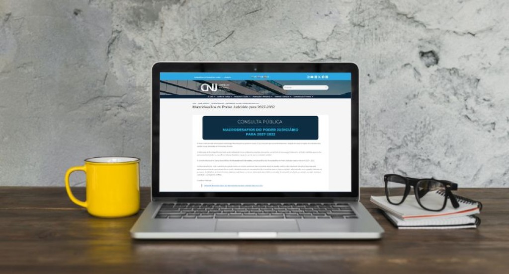 #PraTodosVerem: A imagem exibe um notebook aberto sobre uma mesa de madeira, mostrando em sua tela um website, que parece ser do Conselho Nacional de Justiça (CNJ) devido ao logo, com a página de “Consulta Pública – Macrodesafios do Poder Judiciário para 2027-2032”. Ao lado esquerdo do notebook, há uma caneca amarela brilhante. No lado direito, repousam um par de óculos de grau pretos sobre um bloco de notas. O fundo da cena é uma parede com textura de cimento ou tijolo aparente em tons de cinza.
