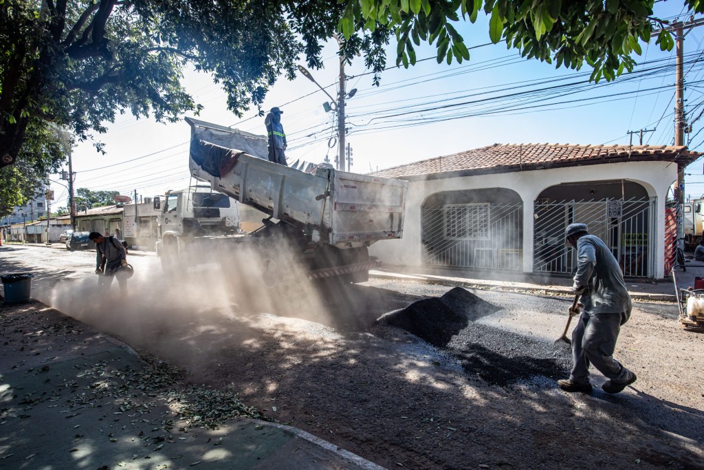 O serviço tem início com o preparo das vias, que inclui a limpeza da área com motobomba. Em alguns casos, é necessário remover a umidade do solo com o apoio de caminhão-pipa. Na sequência, é aplicado o concreto betuminoso usinado a quente (CBUq), material utilizado por sua alta resistência e durabilidade. O procedimento é finalizado com o rastelamento e a compactação da massa asfáltica, utilizando rolo compactador para nivelamento e acabamento.