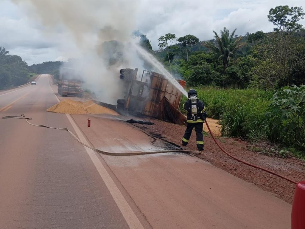 O Corpo de Bombeiros Militar de Mato Grosso (CBMMT) foi acionado na manhã deste domingo (25.1) para atender uma ocorrência de incêndio em uma carreta que transportava soja na BR-163 em Guarantã do Norte (709 km de Cuiabá).