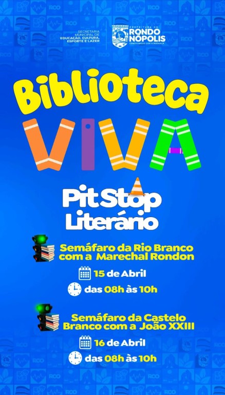 Acontece amanhã (15) e na quarta-feira (16), entre 8h e 10h, dois pit stops nos semáforos entre a Rua Rio Branco e a Avenida Marechal Rondon e entre a Rua Fernando Corrêa da Costa e a Avenida Amazonas, respectivamente, em virtude da Semana Municipal do Livro, comemorada no período que abrange o 18 de abril, Dia Nacional do Livro Infantil.