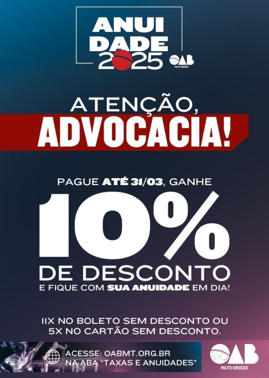 Os advogados e advogadas de Mato Grosso têm até a próxima segunda-feira (31) para aproveitar o desconto de 10% no valor da anuidade 2025 da Ordem dos Advogados do Brasil – Seccional Mato Grosso (OAB-MT). “Estamos alertando advogados e advogadas, que ainda não quitaram a sua anuidade 2025, para que aproveitem a oportunidade e quitem até o dia 31 de março, o benefício do desconto de 10% termina na segunda-feira”, ressalta Max Ferreira Mendes, diretor-tesoureiro da OAB-MT. De acordo com a Resolução que define os valores e regras da anuidade 2025, os pagamentos com desconto podem ser feitos à vista ou pelo cartão de crédito, com a possibilidade de parcelamento em duas vezes.