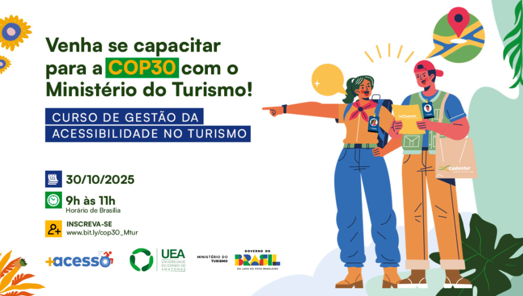 O Ministério do Turismo, em parceria com o Programa Mais Acesso da Universidade do Estado do Amazonas (UEA), convida profissionais do setor turístico para participarem do curso “Gestão da Acessibilidade no Turismo”. A capacitação será realizada nesta quinta-feira (30.10), das 9h às 11h (horário de Brasília-DF), e vai ter transmissão ao vivo pelo perfil do órgão no YouTube.