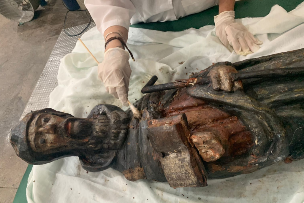 A obra sacra degradada sofreu severos ataques de insetos que provocaram a degradação da estrutura interna e externa, criando porosidade e buracos consideráveis.
