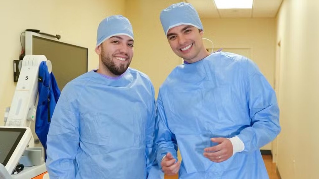 Mia, é fruto de uma barriga solidária, nos Estados Unidos. O casal está no país para acompanhar o parto e apareceu usando toucas e roupas hospitalares antes de entrar na sala cirúrgica.