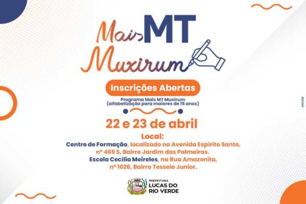 Desenvolvido por meio de uma colaboração entre Governo do Estado de Mato Grosso e Prefeitura de Lucas do Rio Verde, o Programa Mais MT Muxirum está com matrículas abertas para novas turmas de alfabetização no município. O Programa atenderá pessoas com idade acima dos 15 anos, que ainda não tiveram acesso ou oportunidade de aprender a ler e escrever.