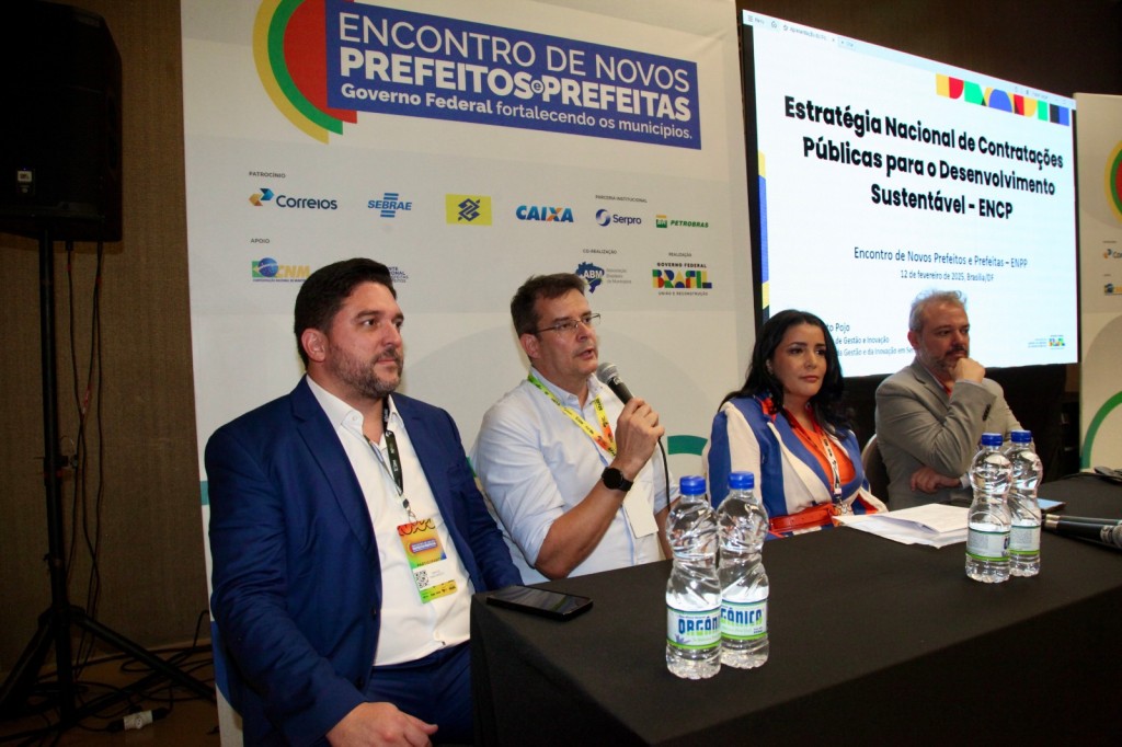 A construção colaborativa da Estratégia Nacional de Contratações Públicas (ENCP) e o impacto das compras públicas para o desenvolvimento sustentável e inclusivo foi tema de conferência, durante o Encontro Nacional de Novos Prefeitos e Prefeitas. O secretário de Gestão e Inovação do Ministério da Gestão e da Inovação em Serviços Públicos (Seges/MGI), Roberto Pojo, moderou a mesa de debate e apresentou os principais desafios, diretrizes e objetivos da ENCP, destacando a importância da cooperação interinstitucional e federativa na construção da Estratégia.