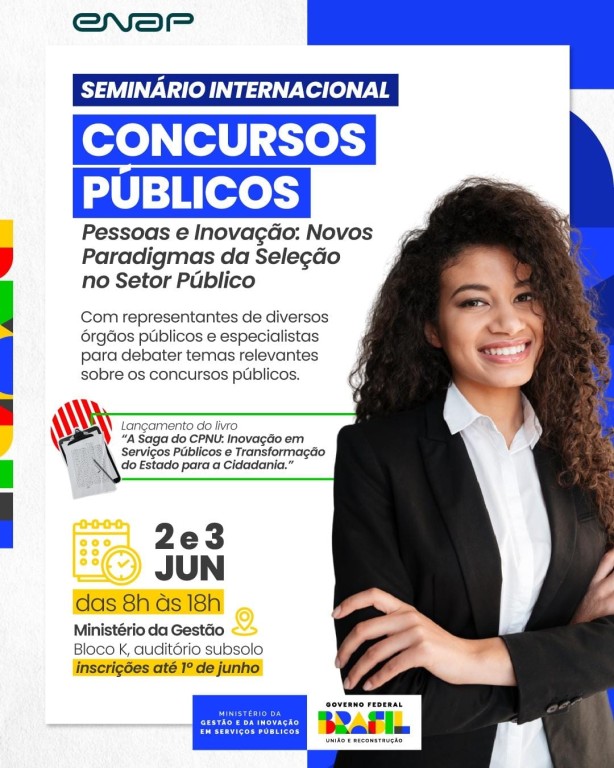 O Ministério da Gestão e da Inovação em Serviços Públicos promove, nos dias 2 e 3 de junho, o Seminário Internacional de Concursos Públicos. O evento reunirá representantes de diversos órgãos públicos e especialistas para debater temas relevantes sobre os concursos públicos no Brasil, com enfoque em aprendizados recentes, desafios logísticos, inclusão e perspectivas para o futuro.