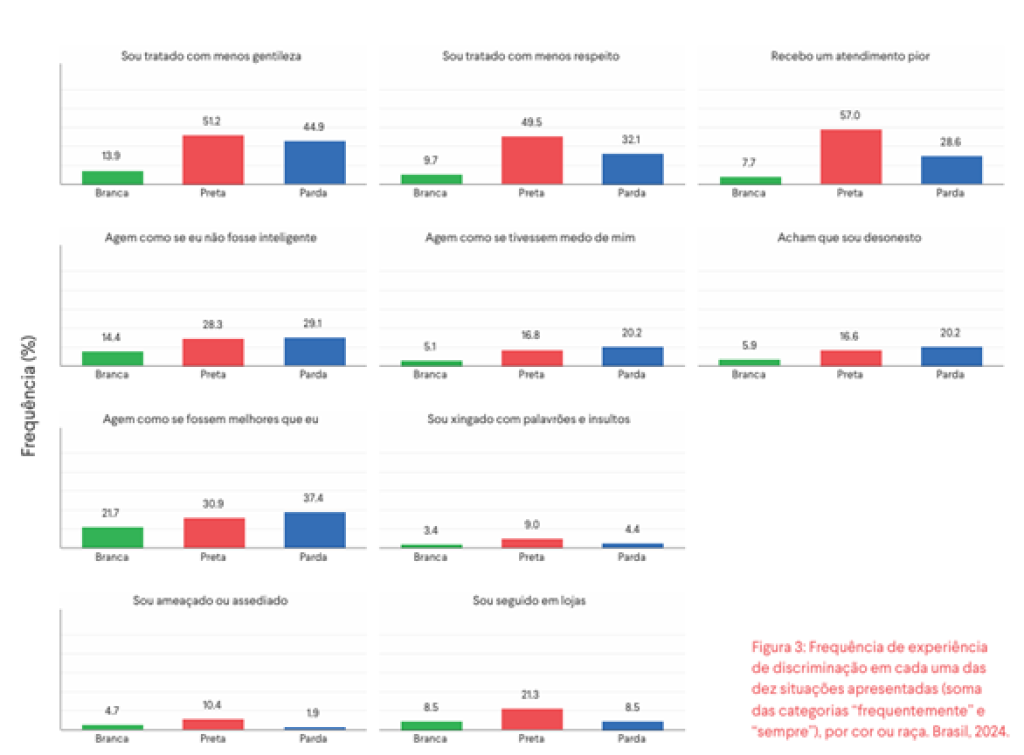 Discriminação Cotidiana pela População Brasileira – Na pesquisa “Experiência de Discriminação Cotidiana pela População Brasileira”, a coleta foi feita por meio de questionário via internet. O levantamento ouviu 2.458 pessoas no país entre agosto e setembro de 2024. Para dar precisão aos dados, considerando que a pesquisa é baseada em uma amostra da população, pesos amostrais foram criados a partir dos dados coletados pelo Censo 2022 e da Pesquisa Nacional de Saúde 2019.