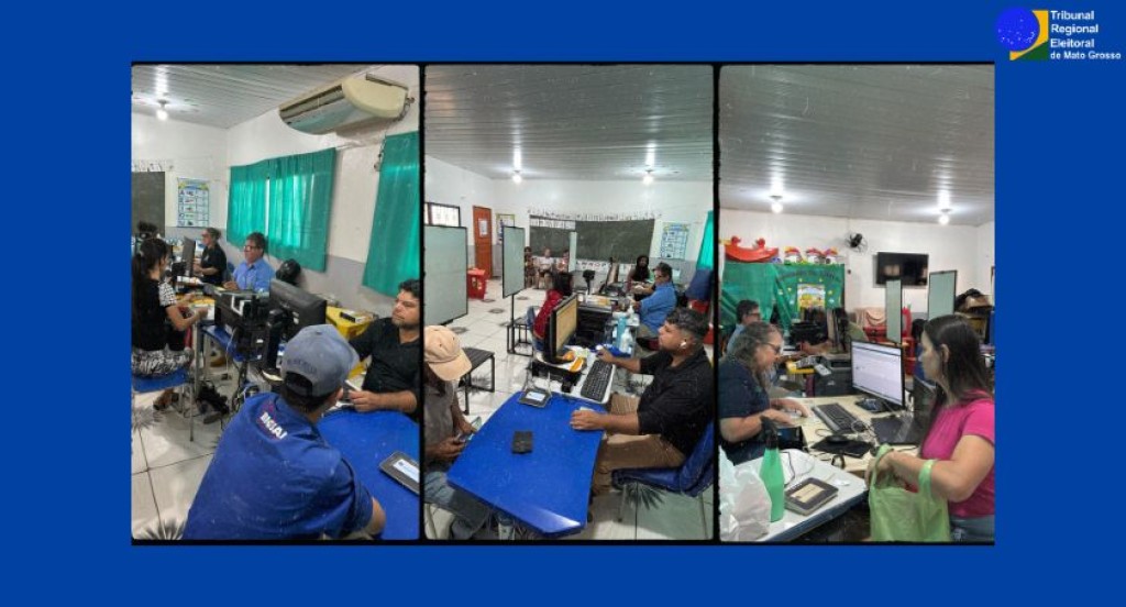 #PraTodosVerem: A imagem mostra um ambiente interno organizado em três cenas lado a lado, retratando atendimentos eleitorais realizados pelo Tribunal Regional Eleitoral de Mato Grosso (TRE-MT). As cenas ocorrem em uma sala simples, em uma escola, com computadores, mesas e cadeiras escolares. Pessoas estão sendo atendidas individualmente por servidores do TRE, realizando serviços como cadastramento biométrico ou atualização de dados eleitorais. O ambiente é iluminado, funcional e transmite a ideia de um mutirão itinerante de atendimento ao eleitor em uma localidade do interior. O logotipo do TRE-MT está visível no canto superior direito da imagem.