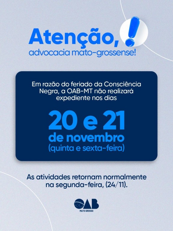 A Ordem dos Advogados do Brasil – Seccional Mato Grosso (OAB-MT) informa que não haverá expediente na sede instituição, em Cuiabá, e nas Subseções, nos dias 20 e 21, esta quinta e sexta-feira, em razão do feriado, alusivo ao Dia da Consciência Negra. A suspensão inclui também os prazos processuais no âmbito da Seccional.