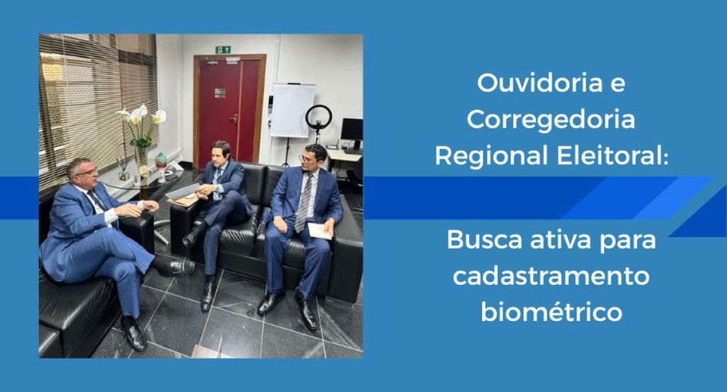 #PraTodosVerem: A imagem mostra três homens de terno sentados em um sofá de escritório, conversando, com documentos em mãos, em um ambiente que conta com mesa, computador e objetos de decoração. Ao lado, sobre um fundo azul, há o texto “Ouvidoria e Corregedoria Regional Eleitoral: Busca ativa para cadastramento biométrico”.
