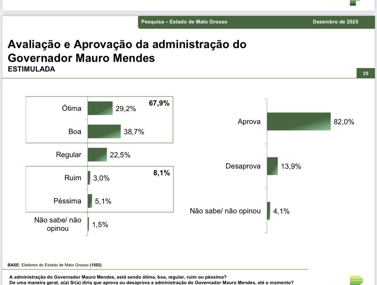 O levantamento ouviu 1.502 mato-grossenses, de 61 municípios, com idades entre 16 e 60 anos. As entrevistas foram realizadas entre os dias 12 e 16 de dezembro. O nível de confiança é de 95%, com margem de erro de cerca de 2,6 pontos percentuais para os resultados gerais.