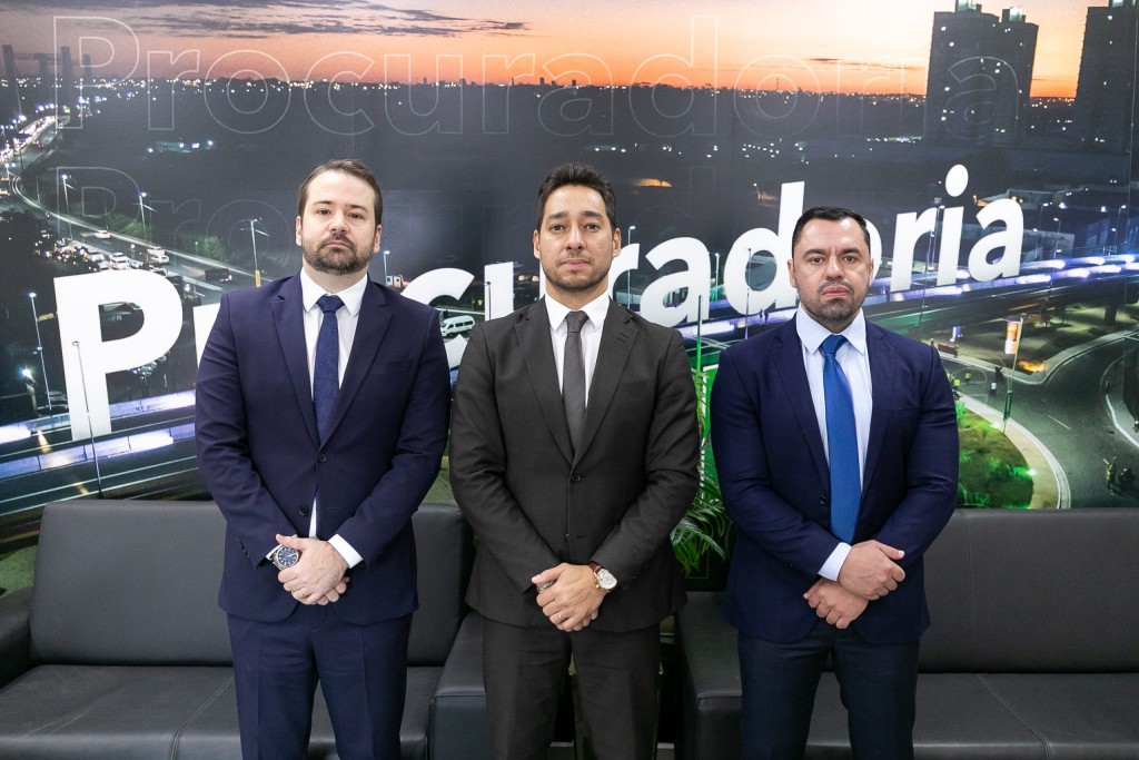 A foto ilustra o procurador-geral do município, Luiz Antônio Araújo Júnior, vestido de terno e gravata de tonalidade cinza. Do lado direito, está o procurador fiscal Ricardo Alves dos Santos Júnior, que veste terno e gravata de cor azul. Também com as mesmas cores e traje social semelhante, do lado direito, está o servidor público de carreira Luiz Antônio Giroldo Filho.