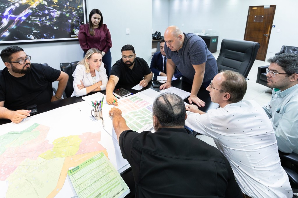 A imagem mostra o prefeito Abilio Brunini na frente da mesa de reunião olhando um mapa do Mercado do Porto. Ela usa cinza e preto. Ao redor da mesa também se encontra a vereadora Katiuscia Manteli usando branco, os secretários de Agricultura, Felipe Corrêa – usando camisa verde – e de Turismo, Fernando Medeiros, camiseta preta. Também estão ao redor os permissionários e servidores da Prefeitura de Cuiabá.