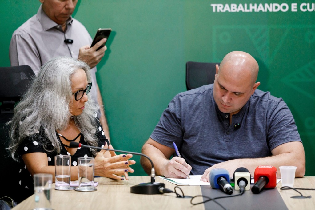 A imagem mostra o prefeito de Cuiabá, Abilio Brunini e a secretária Lúcia Helena, sentados em uma mesa de reunião. O prefeito assina um documento, usando camisa cinza e a secretária o observa.