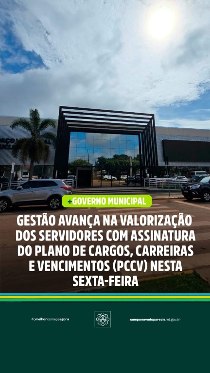O Governo Municipal de Campo Novo do Parecis realiza, nesta sexta-feira (18), às 17h, no Gabinete do Prefeito, a Solenidade de Assinatura do Plano de Cargos, Carreiras e Vencimentos (PCCV) dos servidores públicos municipais, previsto na Lei Municipal nº 1.822/2016.