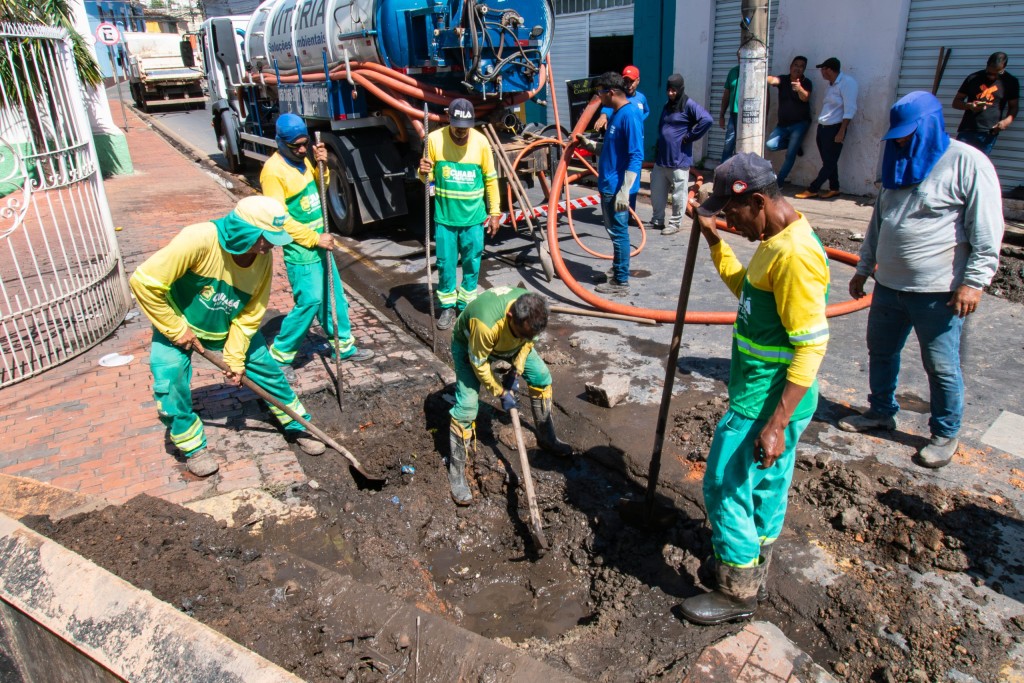 Nas imagens, há uma equipe de trabalhadores realizando a limpeza de um bueiro em uma rua pavimentada. Alguns utilizam ferramentas como pás e enxadas para remover resíduos e lama acumulados. Ao fundo, é possível ver um caminhão de sucção. Algumas pessoas observam a operação, posicionadas na calçada.