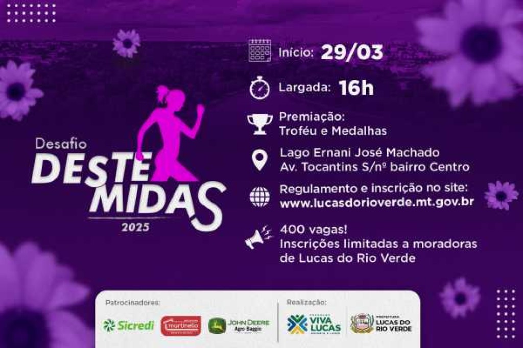 A competição, que terá percurso de aproximadamente cinco quilômetros, é voltada para mulheres com 16 anos ou mais, residentes no município. A prova terá largada e chegada no Lago Ernani José Machado, no dia 29 de Março de 2025, às 16h.