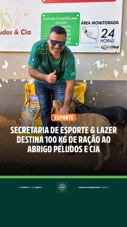 A Secretaria de Esporte & Lazer de Campo Novo do Parecis realizou, nesta semana, a entrega de 100 kg de ração ao Abrigo Peludos e Cia. A doação foi fruto da arrecadação obtida por meio de diligências e ações solidárias ocorridas durante o Campeonato Municipal de Futebol Society, que segue até o final do mês de agosto.