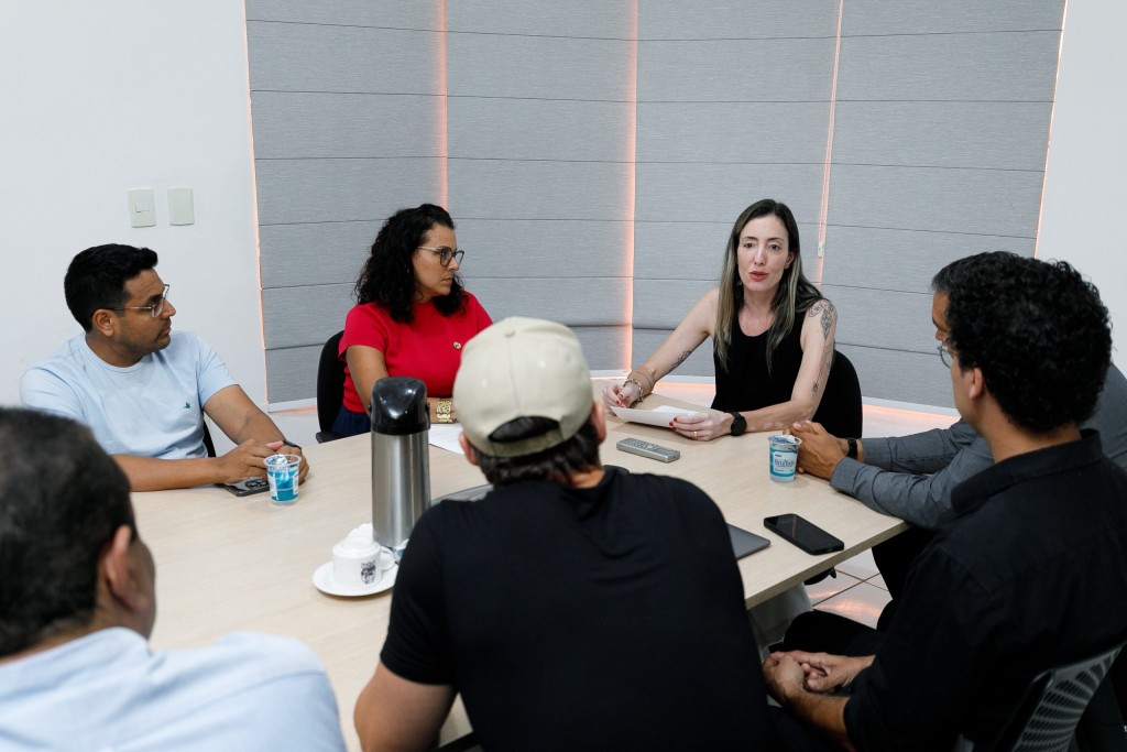 A foto mostra uma reunião em uma sala e com várias pessoas sentadas ao redor de uma mesa grande, de madeira clara, com diferentes objetos sobre ela, como garrafas térmicas, copos descartáveis e um notebook. Uma mulher, ao centro da imagem, de cabelo loiro e vestindo preto, sendo a secretária Municipal de Ordem Pública gesticula enquanto fala conduzindo a conversa. À sua esquerda está outra mulher, de cabelo cacheado e blusa vermelha, sendo a presidente da Abrasel, Lorenna Bezerra ouvindo atentamente. Os demais participantes, todos homens, estão distribuídos ao redor da mesa, observando e ouvindo. Todos os participantes estão focados no diálogo.