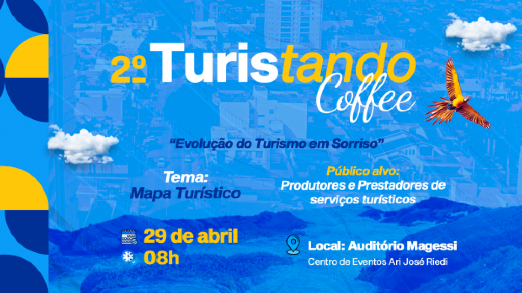 No próximo dia 29 de abril, às 8h, o auditório Magessi, localizado no Centro de Eventos Ari José Riedi, recebe a segunda edição do Turistando Coffee. O evento, promovido pela Secretaria Municipal de Desenvolvimento Econômico e Turismo, terá como tema central o “Mapa Turístico de Sorriso”. O objetivo é reunir empresários e profissionais do setor para debater e contribuir com a construção colaborativa do mapa do turismo de Sorriso.
