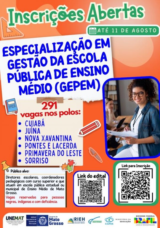 A Universidade do Estado de Mato Grosso (UNEMAT) lançou o edital nº 13/2025 – PROEG/DEAD para o curso de especialização lato sensu em Gestão da Escola Pública de Ensino Médio (GEPEM), ofertado na modalidade a distância, por meio do Sistema Universidade Aberta do Brasil (UAB). Para o Polo UAB de Sorriso estão disponíveis 40 vagas.