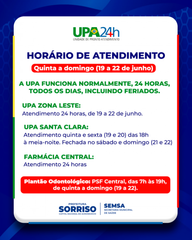 ✅ UPA Santa Clara: atenderá nos dias 19 e 20 (quinta e sexta-feira), das 18h à meia-noite. No sábado e domingo (21 e 22), a unidade permanecerá fechada;